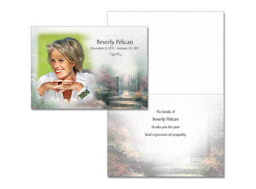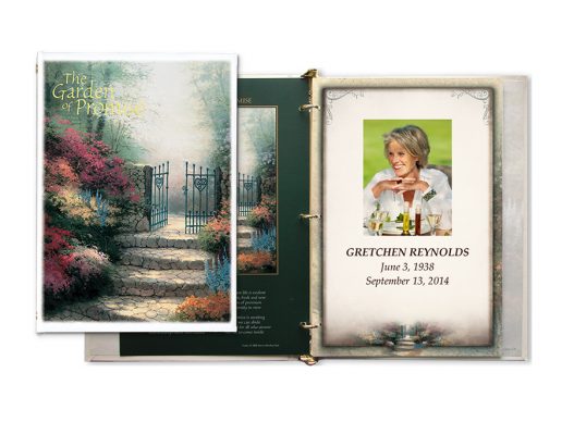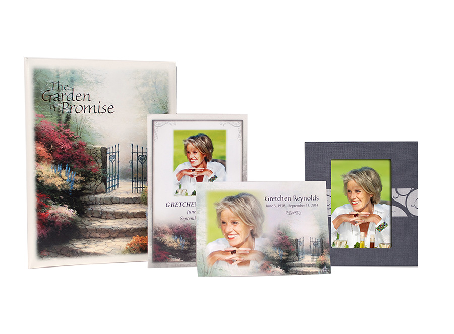 - Includes memorial register book, 100 large memory folders (with 4 photos), 50 premium acknowledgement cards with photo, and a bookshelf box
