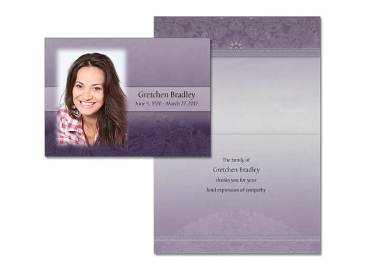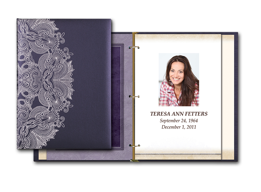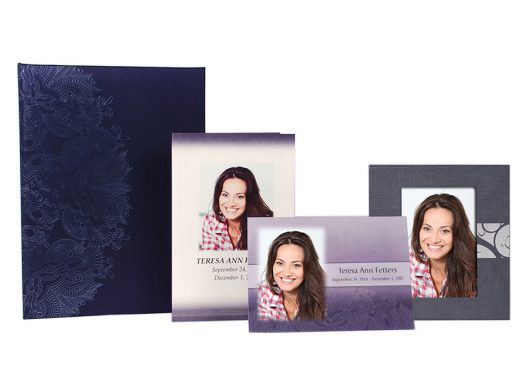 Includes memorial register book, 100 bi-fold memory folders (with 4 photos), 50 premium acknowledgement cards with photo, and a bookshelf box