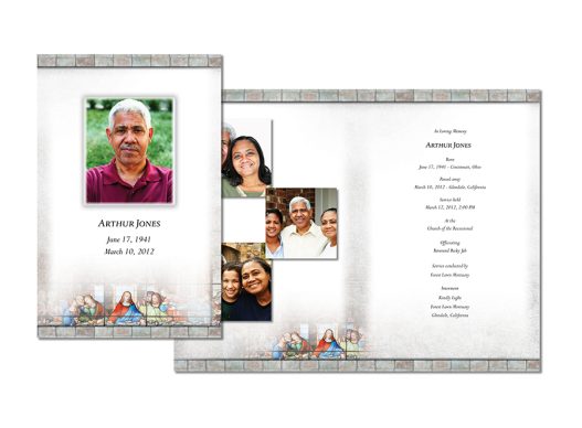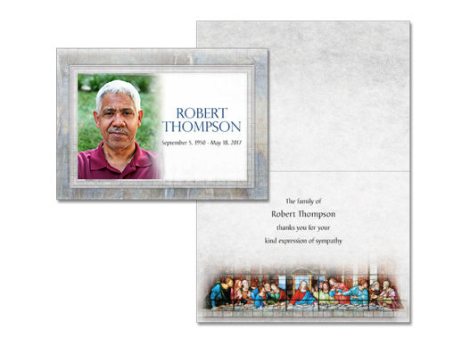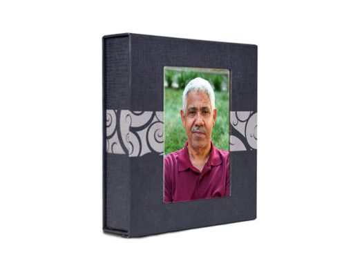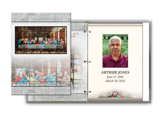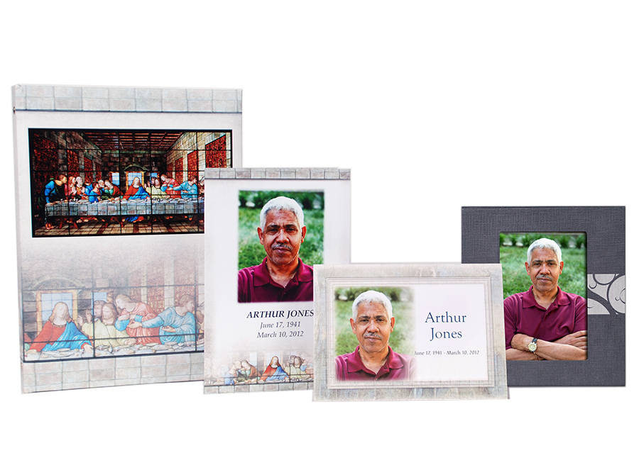 Includes memorial register book, 100 bi-fold memory folders (with 4 photos), 50 premium acknowledgement cards with photo, and a bookshelf box